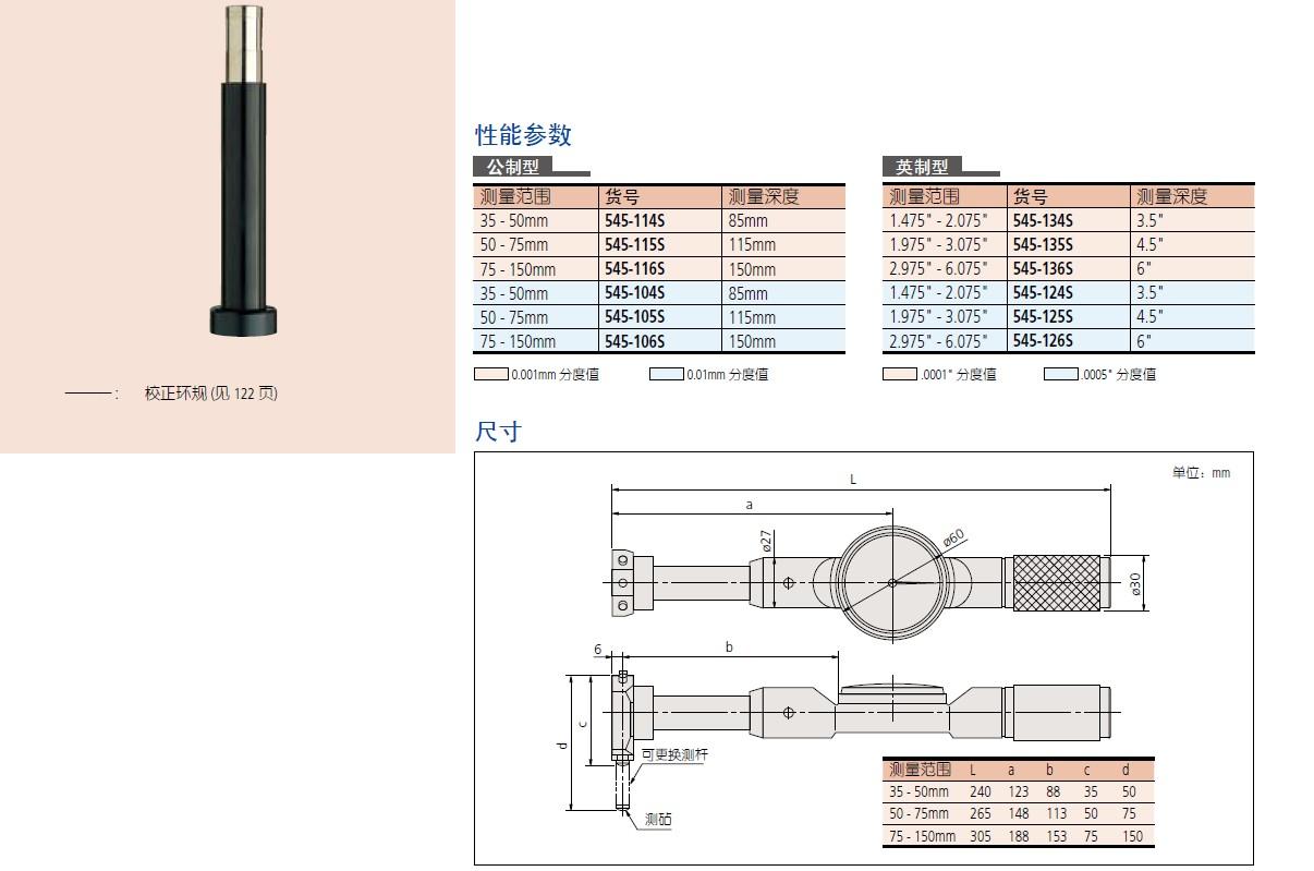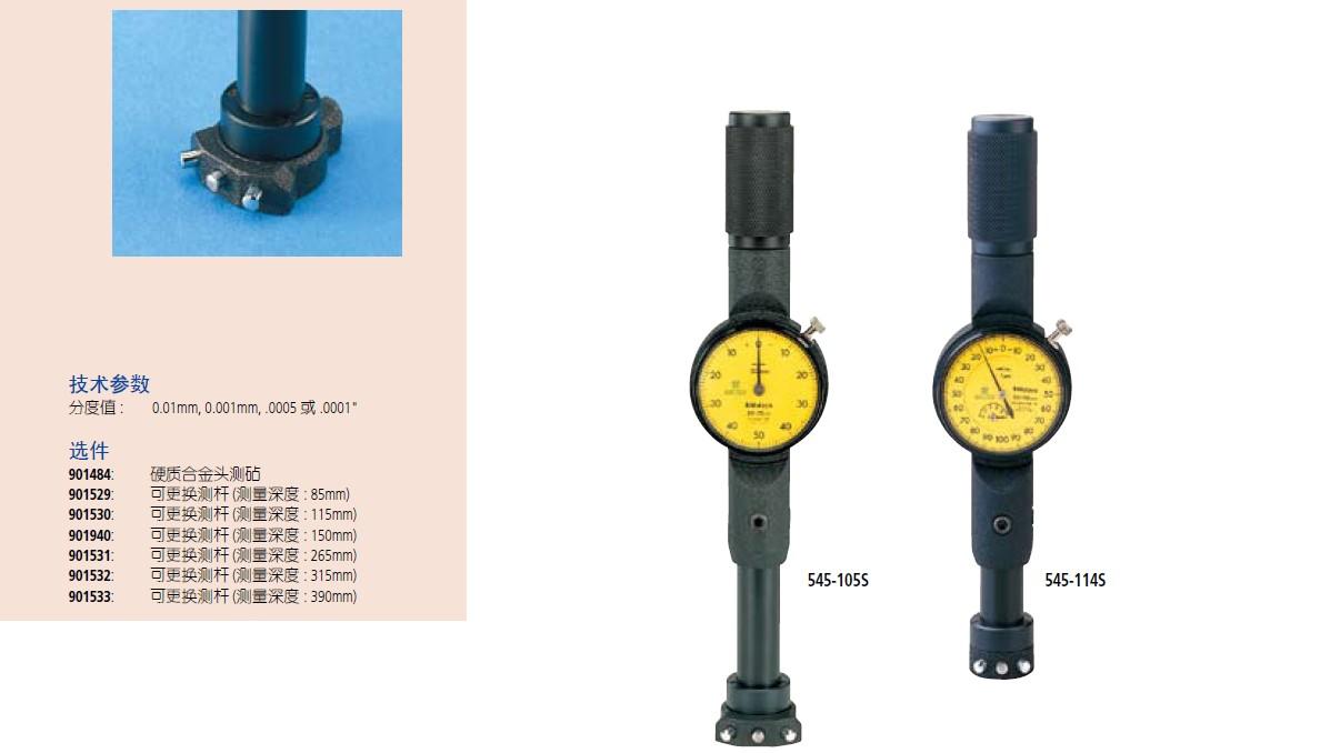 ? 測針帶有硬質合金頭經久耐用。 ? 可更換延長測砧 (螺絲內置型) 可擴大測量 范圍。 ? 硬質合金砧選件 (901484)。 ? 兩個定位銷可確保重復測量精度。 ? 內徑表可垂直放置,易于調零。 ? 可更換測桿選件實現不同深度的內徑 測量。